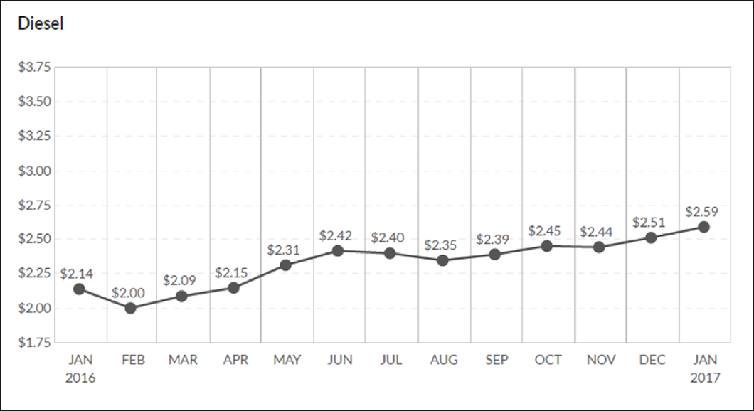 Diesel prices have risen 59 cents per gallon since February, and analysts are predicting prices to continue to rise in 2017. The Organization of Petroleum Exporting Countries (OPEC) announced that they plan to cut production this year and, at current prices, there's not much incentive to increase U.S. oil production.